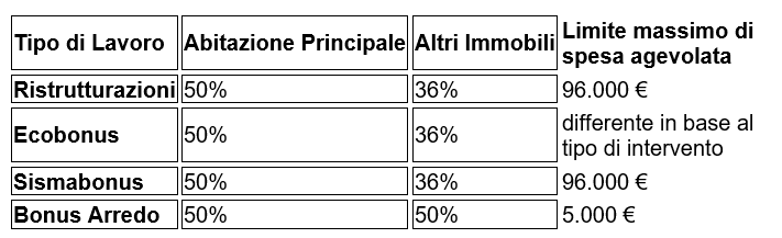 - Ristrutturazioni: 50% (prima casa) / 36% (altri immobili)